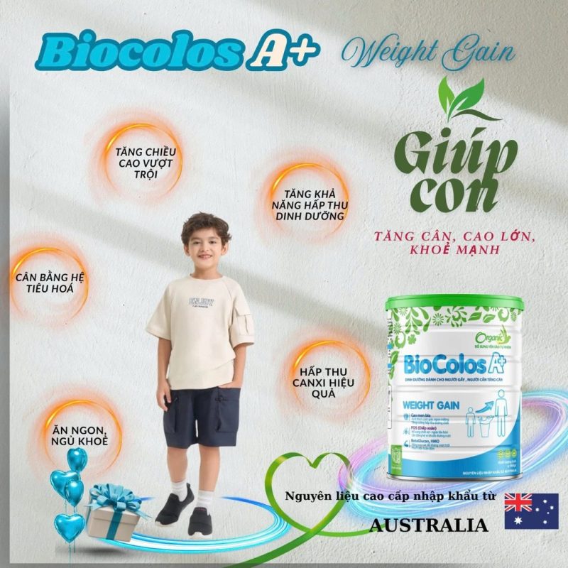 Việc bổ sung đầy đủ dưỡng chất giúp cơ thể duy trì năng lượng ổn định suốt ngày dài. Người dùng cảm nhận rõ sự cải thiện về sức khỏe và thể lực khi sử dụng Biocolos A+ Weight Gain. Sản phẩm đặc biệt phù hợp với người lao động nặng hoặc học sinh, sinh viên có cường độ sinh hoạt cao. Khi cơ thể khỏe hơn, quá trình tăng cân cũng diễn ra thuận lợi hơn. Đây là công dụng mang tính hỗ trợ toàn diện. Sức khỏe tốt chính là nền tảng để tăng cân hiệu quả.